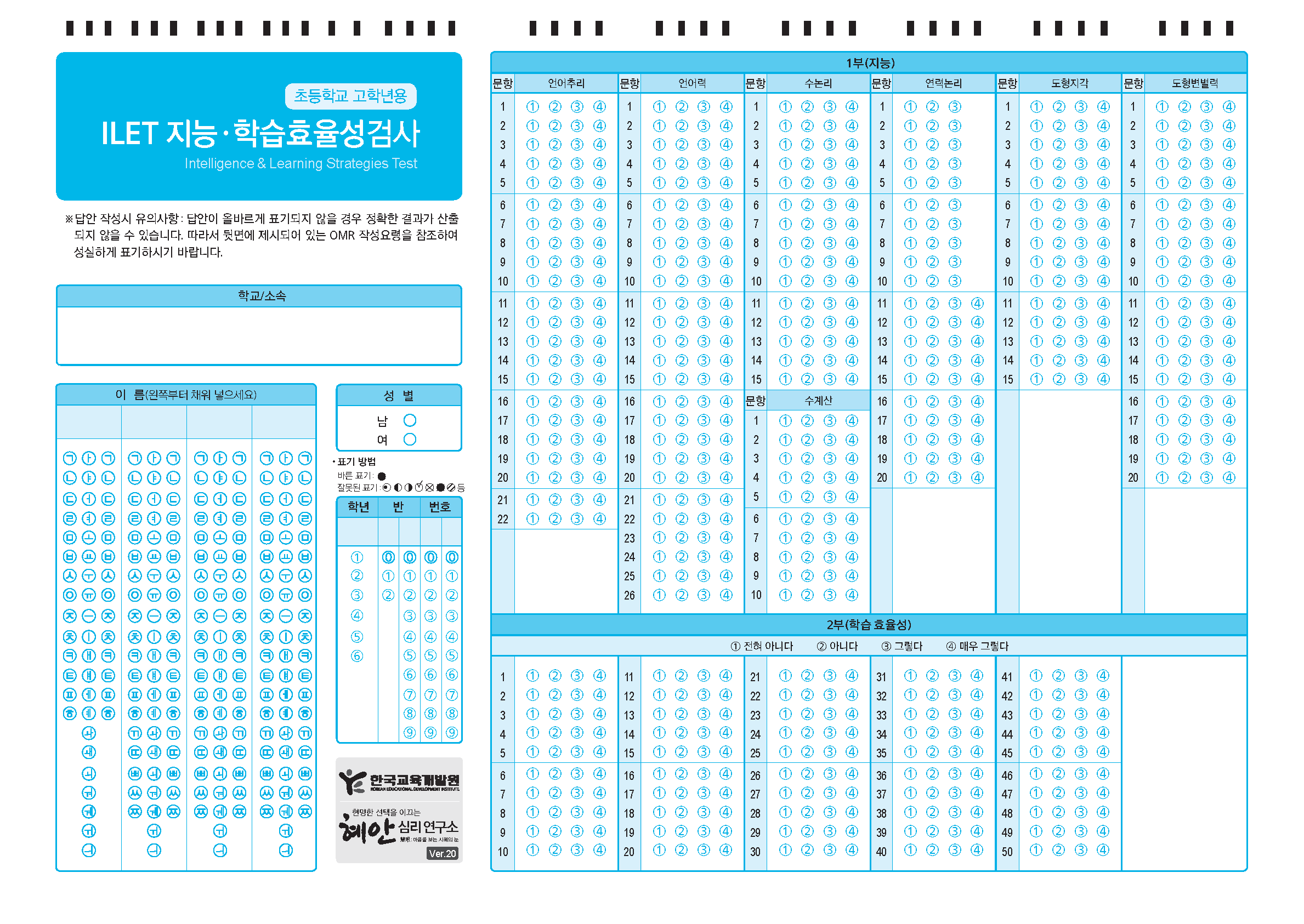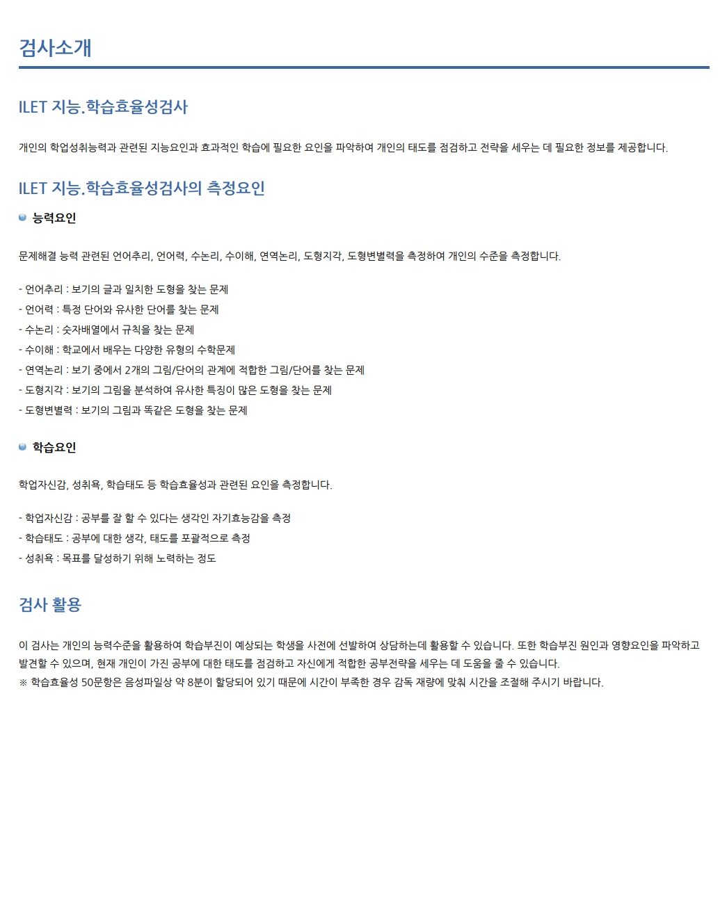 컨텐츠(본문)영역 전문가/기관심리검사 Home 전문가/기관심리검사 특징 및 제공서비스 특징 및 제공서비스 검사종류 및 가격 상품 상세 구매 ILET 지능학습효율성검사(초456) 추천 음성지원 분류 지능 저자/연구개발 한국적성연구소 검사대상 초등 4~6학년 문항수 178문항 소요시간 약 40분 참조 ※ 온라인검사를 실시하기 위해서는 검사실시코드를 구매하여 검사를 진행하시면 됩니다. 세부상품 (필수)선택해주세요. 검사실시코드 (6,000원) 검사지 + 검사실시코드 (6,500원) 총 검사 상품 금액 0원 검사맛보기 장바구니 주문하기 WEB결과샘플 PDF결과샘플 피검자(동일검사를 2회이상 실시)의 변화추이를 확인하는데 도움이 됩니다. 개인웹비교결과샘플 개인사전사후결과샘플 개인누적비교결과샘플 그룹(동일검사를 2회이상 실시)의 변화추이를 확인하는데 도움이 됩니다. 그룹종합결과샘플 그룹사전사후결과샘플 그룹누적비교결과샘플 검사정보 관련검사 상품 검사문의 관련검사 상품 관련 심리검사 ILET 지능학습효율성검사(초23) 검사문의 Page 1 / 0 총 0건 해당 검사에 대한 문의만 해주시길 바랍니다. 검사문의 쓰기 게시판 리스트 번호 제목 답변상태 작성자 작성일 No Data.