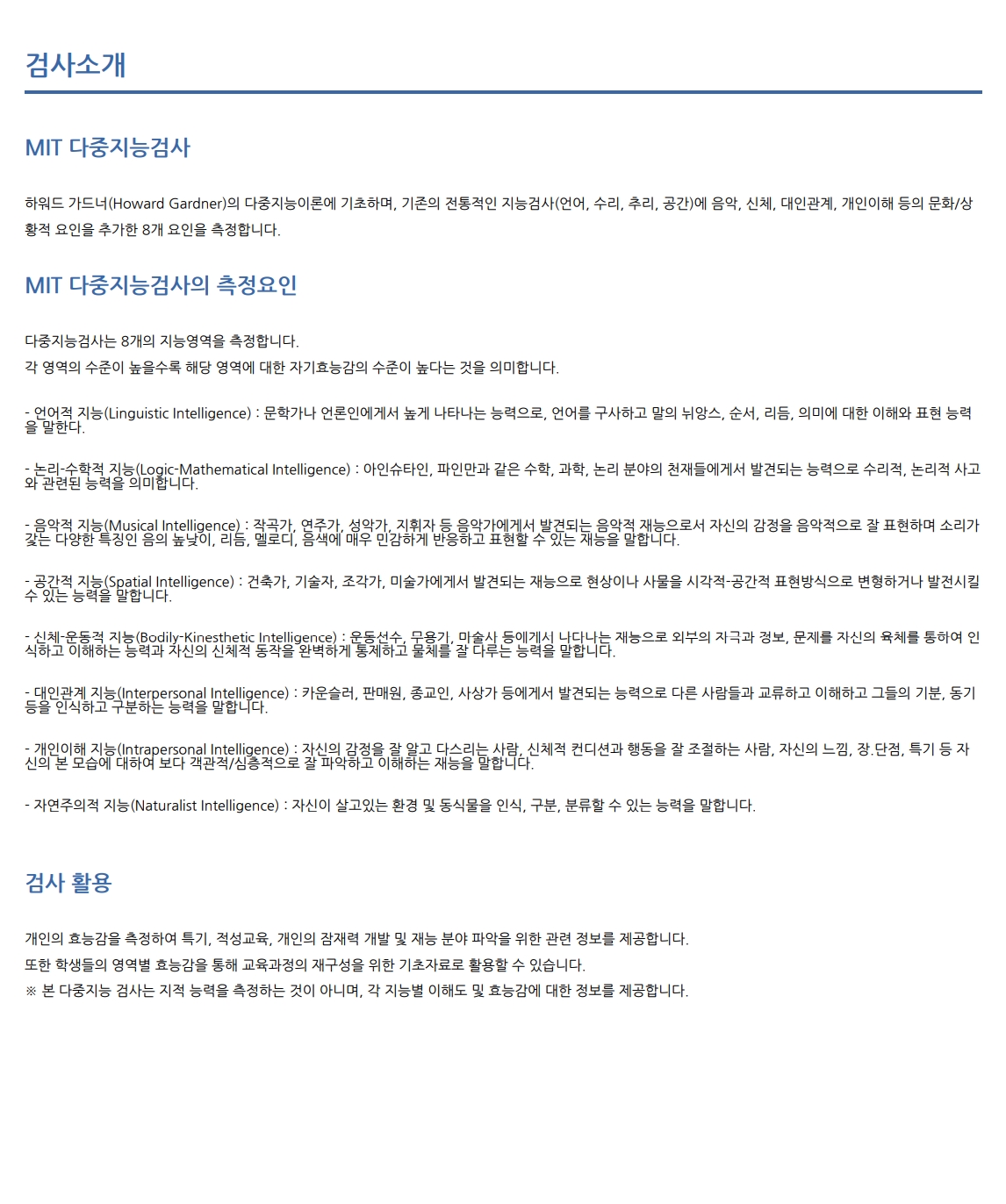 컨텐츠(본문)영역 전문가/기관심리검사 Home 전문가/기관심리검사 특징 및 제공서비스 특징 및 제공서비스 검사종류 및 가격 상품 상세 구매 MIT 다중지능검사(고) 추천 인기 음성지원 분류 지능 저자/연구개발 정종진 교수 검사대상 고등학생 문항수 96문항 소요시간 약 40분 참조 ※ 온라인검사를 실시하기 위해서는 검사실시코드를 구매하여 검사를 진행하시면 됩니다. 세부상품 (필수)선택해주세요. 검사실시코드 (4,000원) 검사지 + 검사실시코드 (4,500원) 총 검사 상품 금액 0원 검사맛보기 장바구니 주문하기 WEB결과샘플 PDF결과샘플 피검자(동일검사를 2회이상 실시)의 변화추이를 확인하는데 도움이 됩니다. 개인웹비교결과샘플 개인사전사후결과샘플 개인누적비교결과샘플 그룹(동일검사를 2회이상 실시)의 변화추이를 확인하는데 도움이 됩니다. 그룹종합결과샘플 그룹사전사후결과샘플 그룹누적비교결과샘플 검사정보 관련검사 상품 검사문의 관련검사 상품 관련 심리검사 MIT 다중지능검사(초) MIT 다중지능검사(중) 검사문의 Page 1 / 0 총 0건 해당 검사에 대한 문의만 해주시길 바랍니다. 검사문의 쓰기 게시판 리스트 번호 제목 답변상태 작성자 작성일 No Data.