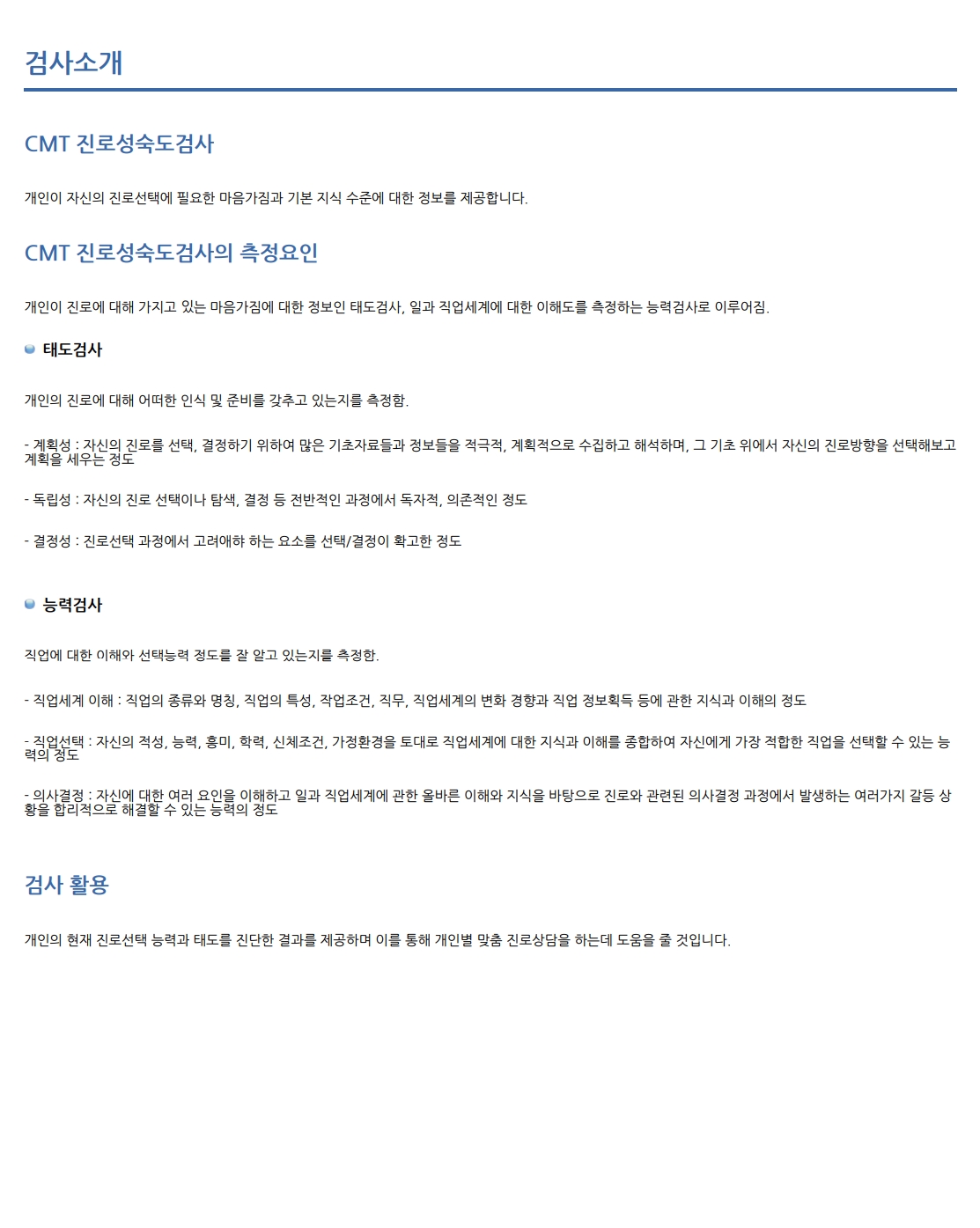 컨텐츠(본문)영역 전문가/기관심리검사 Home 전문가/기관심리검사 특징 및 제공서비스 특징 및 제공서비스 검사종류 및 가격 상품 상세 구매 CMT 진로성숙도검사(중) 음성지원 분류 진로 저자/연구개발 한국교육개발원 교육학 박사 임두순, 교육학 박사 장석민 검사대상 중학생 문항수 96문항 소요시간 약 45분 참조 ※ 온라인검사를 실시하기 위해서는 검사실시코드를 구매하여 검사를 진행하시면 됩니다. 세부상품 (필수)선택해주세요. 검사실시코드 (4,000원) 검사지 + 검사실시코드 (4,500원) 총 검사 상품 금액 0원 검사맛보기 장바구니 주문하기 WEB결과샘플 PDF결과샘플 피검자(동일검사를 2회이상 실시)의 변화추이를 확인하는데 도움이 됩니다. 개인웹비교결과샘플 개인사전사후결과샘플 개인누적비교결과샘플 그룹(동일검사를 2회이상 실시)의 변화추이를 확인하는데 도움이 됩니다. 그룹종합결과샘플 그룹사전사후결과샘플 그룹누적비교결과샘플 검사정보 관련검사 상품 검사문의 관련검사 상품 관련 심리검사 CMT 진로성숙도검사(고) 검사문의 Page 1 / 0 총 0건 해당 검사에 대한 문의만 해주시길 바랍니다. 검사문의 쓰기 게시판 리스트 번호 제목 답변상태 작성자 작성일 No Data.