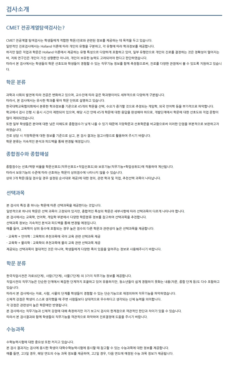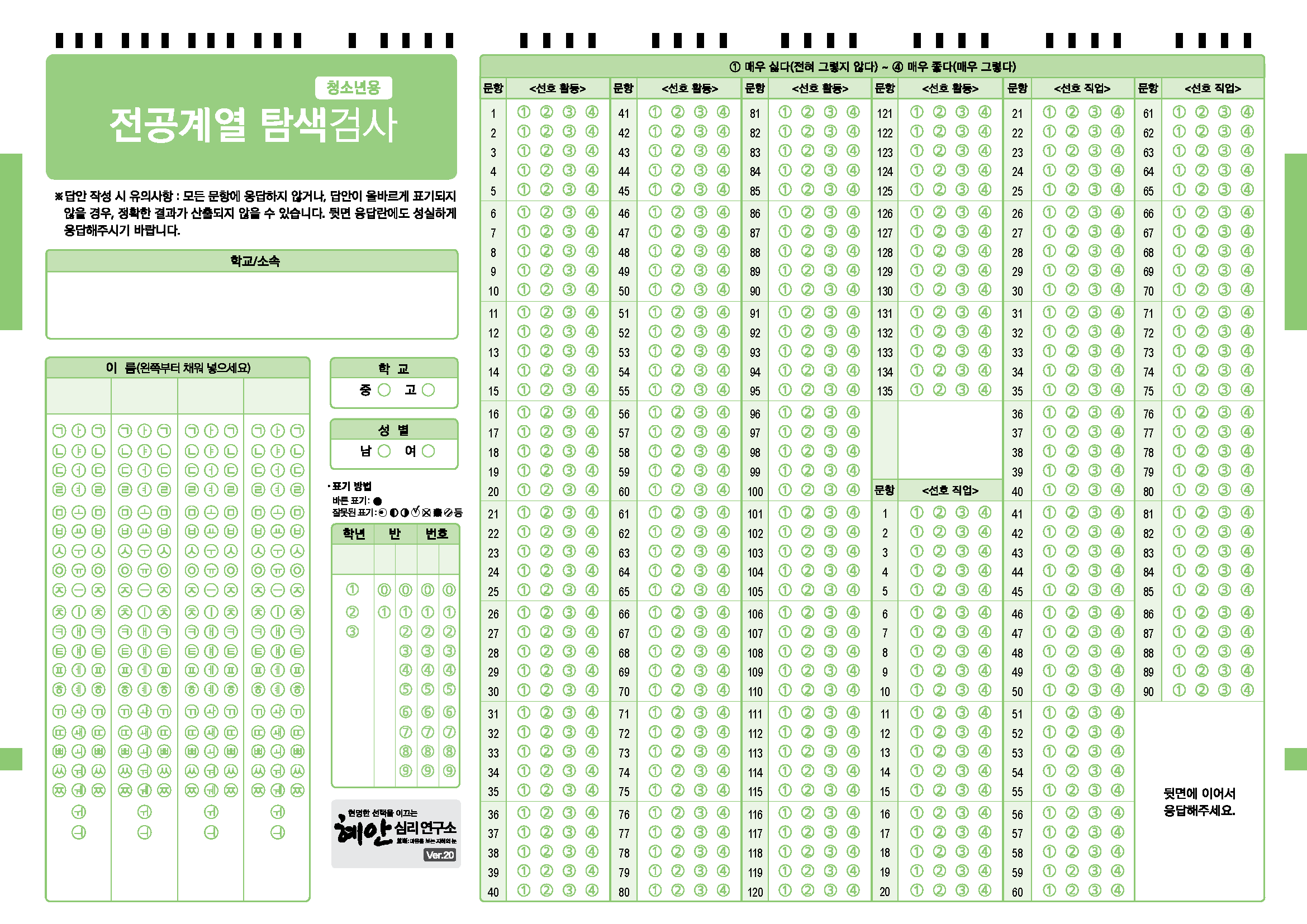 컨텐츠(본문)영역 전문가/기관심리검사 Home 전문가/기관심리검사 특징 및 제공서비스 특징 및 제공서비스 검사종류 및 가격 상품 상세 구매 CMET 전공계열탐색검사(중3) 고교학점제 음성지원 분류 진로 저자/연구개발 혜안심리연구소 검사대상 중3학생 문항수 322문항 소요시간 약 45분 참조 ※ 온라인검사를 실시하기 위해서는 검사실시코드를 구매하여 검사를 진행하시면 됩니다. 세부상품 (필수)선택해주세요. 검사실시코드 (5,000원) 검사지 + 검사실시코드 (5,500원) 총 검사 상품 금액 0원 검사맛보기 장바구니 주문하기 WEB결과샘플 PDF결과샘플 피검자(동일검사를 2회이상 실시)의 변화추이를 확인하는데 도움이 됩니다. 개인웹비교결과샘플 개인사전사후결과샘플 개인누적비교결과샘플 그룹(동일검사를 2회이상 실시)의 변화추이를 확인하는데 도움이 됩니다. 그룹종합결과샘플 그룹사전사후결과샘플 그룹누적비교결과샘플 검사정보 관련검사 상품 검사문의 관련검사 상품 관련 심리검사 CMET 전공계열탐색검사(고) 검사문의 Page 1 / 0 총 0건 해당 검사에 대한 문의만 해주시길 바랍니다. 검사문의 쓰기 게시판 리스트 번호 제목 답변상태 작성자 작성일 No Data.