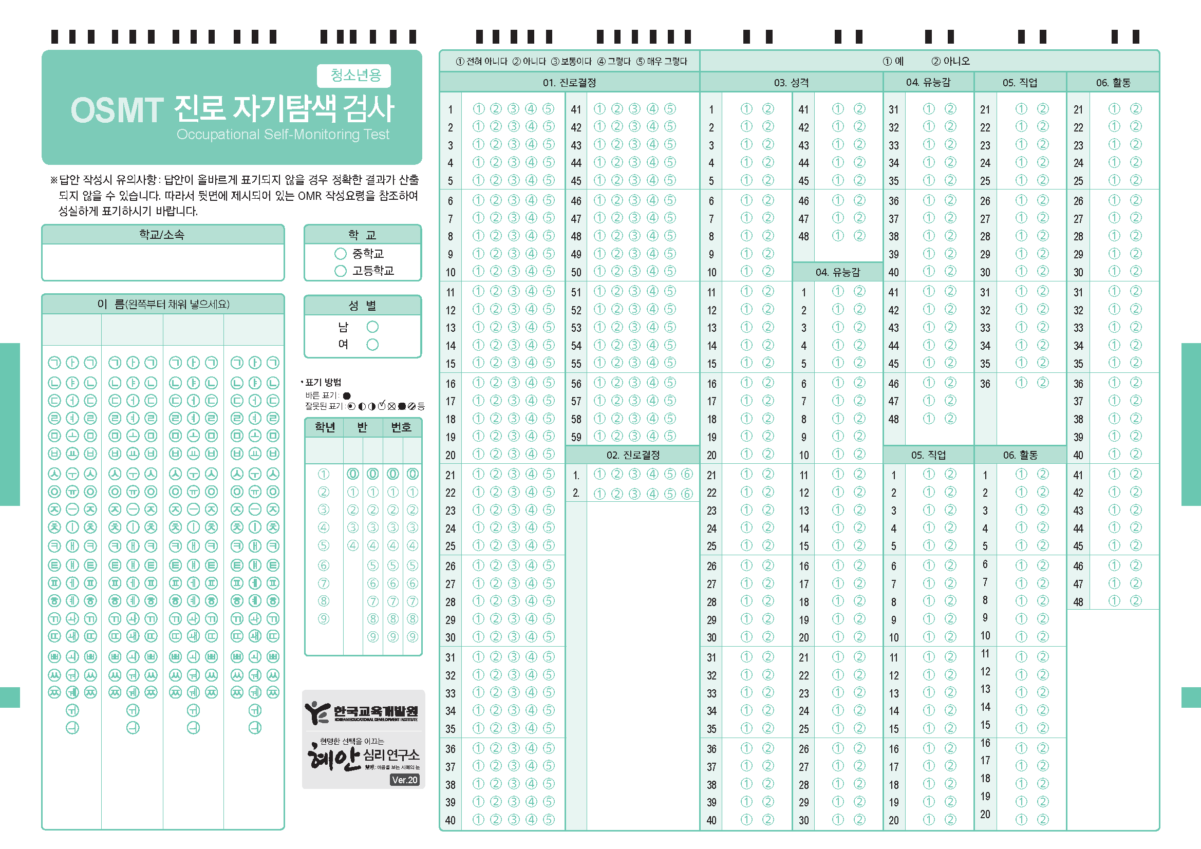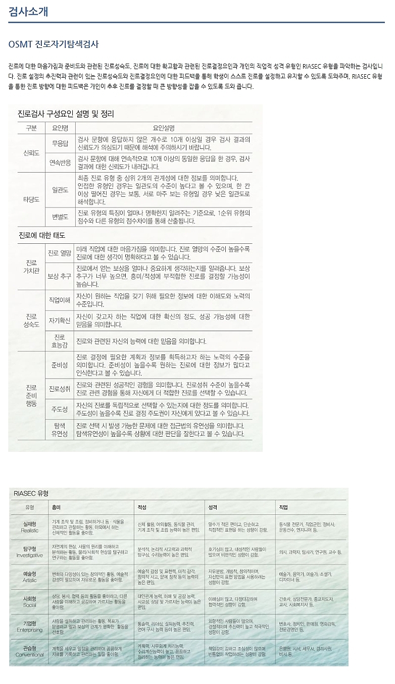 컨텐츠(본문)영역 전문가/기관심리검사 Home 전문가/기관심리검사 특징 및 제공서비스 특징 및 제공서비스 검사종류 및 가격 상품 상세 구매 OSMT 진로자기탐색검사(중) 인기 음성지원 분류 진로 저자/연구개발 혜안심리연구소 검사대상 중학생 문항수 241문항 소요시간 약 45분 참조 ※ 온라인검사를 실시하기 위해서는 검사실시코드를 구매하여 검사를 진행하시면 됩니다. 세부상품 (필수)선택해주세요. 검사실시코드 (4,000원) 검사지 + 검사실시코드 (4,500원) 총 검사 상품 금액 0원 검사맛보기 장바구니 주문하기 WEB결과샘플 PDF결과샘플 피검자(동일검사를 2회이상 실시)의 변화추이를 확인하는데 도움이 됩니다. 개인웹비교결과샘플 개인사전사후결과샘플 개인누적비교결과샘플 그룹(동일검사를 2회이상 실시)의 변화추이를 확인하는데 도움이 됩니다. 그룹종합결과샘플 그룹사전사후결과샘플 그룹누적비교결과샘플 검사정보 관련검사 상품 검사문의 관련검사 상품 관련 심리검사 OSMT 진로자기탐색검사(고) 검사문의 Page 1 / 0 총 0건 해당 검사에 대한 문의만 해주시길 바랍니다. 검사문의 쓰기 게시판 리스트 번호 제목 답변상태 작성자 작성일 No Data.