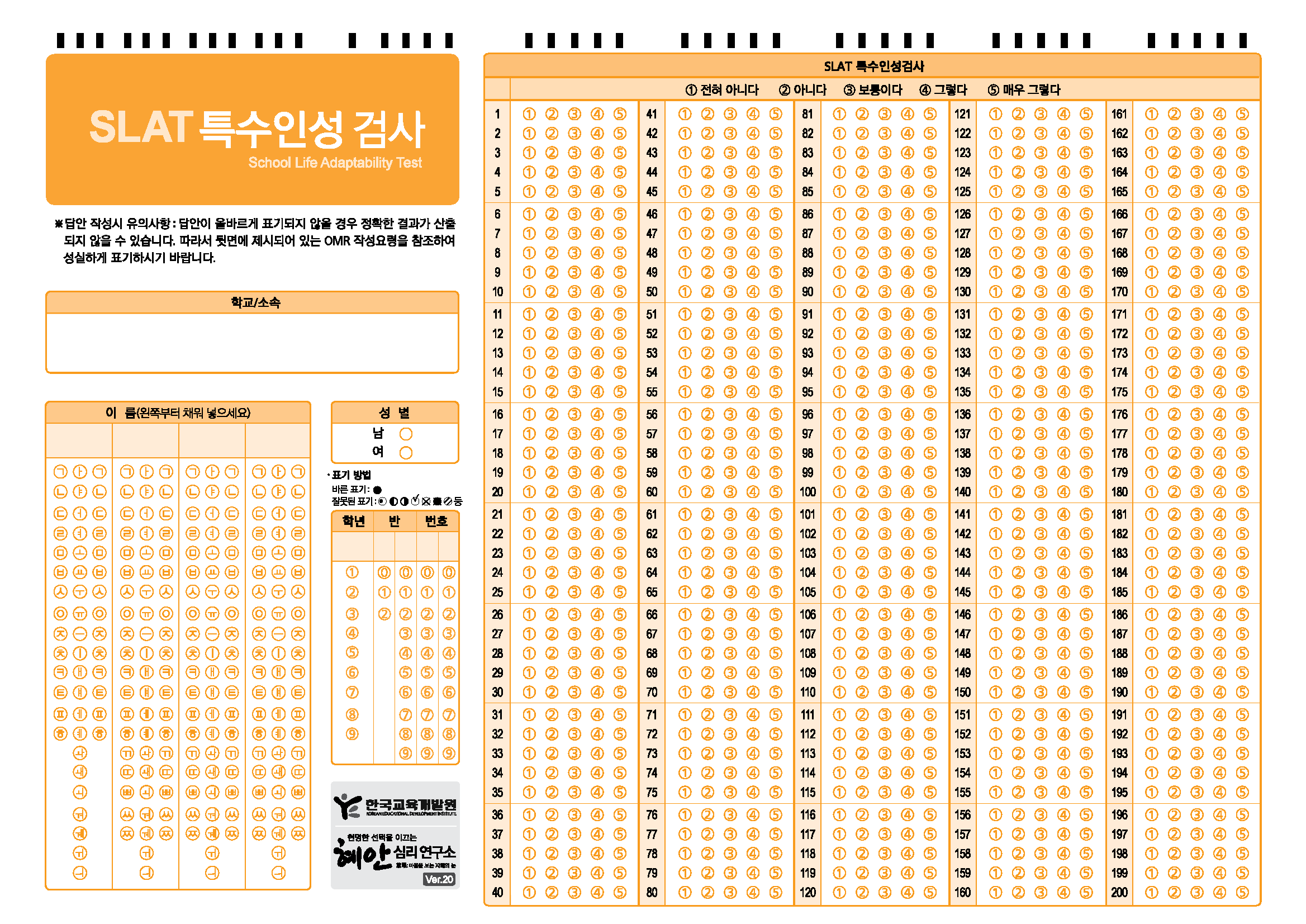 컨텐츠(본문)영역 전문가/기관심리검사 Home 전문가/기관심리검사 특징 및 제공서비스 특징 및 제공서비스 검사종류 및 가격 상품 상세 구매 SLAT 특수인성검사(고) 추천 인기 음성지원 분류 성격(인성) 저자/연구개발 양종국 교수 검사대상 고등학생 문항수 200문항 소요시간 약 40분 ~ 45분 참조 ※ 온라인검사를 실시하기 위해서는 검사실시코드를 구매하여 검사를 진행하시면 됩니다. 세부상품 (필수)선택해주세요. 검사실시코드 (4,000원) 검사지 + 검사실시코드 (4,500원) 총 검사 상품 금액 0원 검사맛보기 장바구니 주문하기 WEB결과샘플 PDF결과샘플 피검자(동일검사를 2회이상 실시)의 변화추이를 확인하는데 도움이 됩니다. 개인웹비교결과샘플 개인사전사후결과샘플 개인누적비교결과샘플 그룹(동일검사를 2회이상 실시)의 변화추이를 확인하는데 도움이 됩니다. 그룹종합결과샘플 그룹사전사후결과샘플 그룹누적비교결과샘플 검사정보 관련검사 상품 검사문의 관련검사 상품 관련 심리검사 SLAT 특수인성검사(초) SLAT 특수인성검사(중) 검사문의 Page 1 / 0 총 0건 해당 검사에 대한 문의만 해주시길 바랍니다. 검사문의 쓰기 게시판 리스트 번호 제목 답변상태 작성자 작성일 No Data.