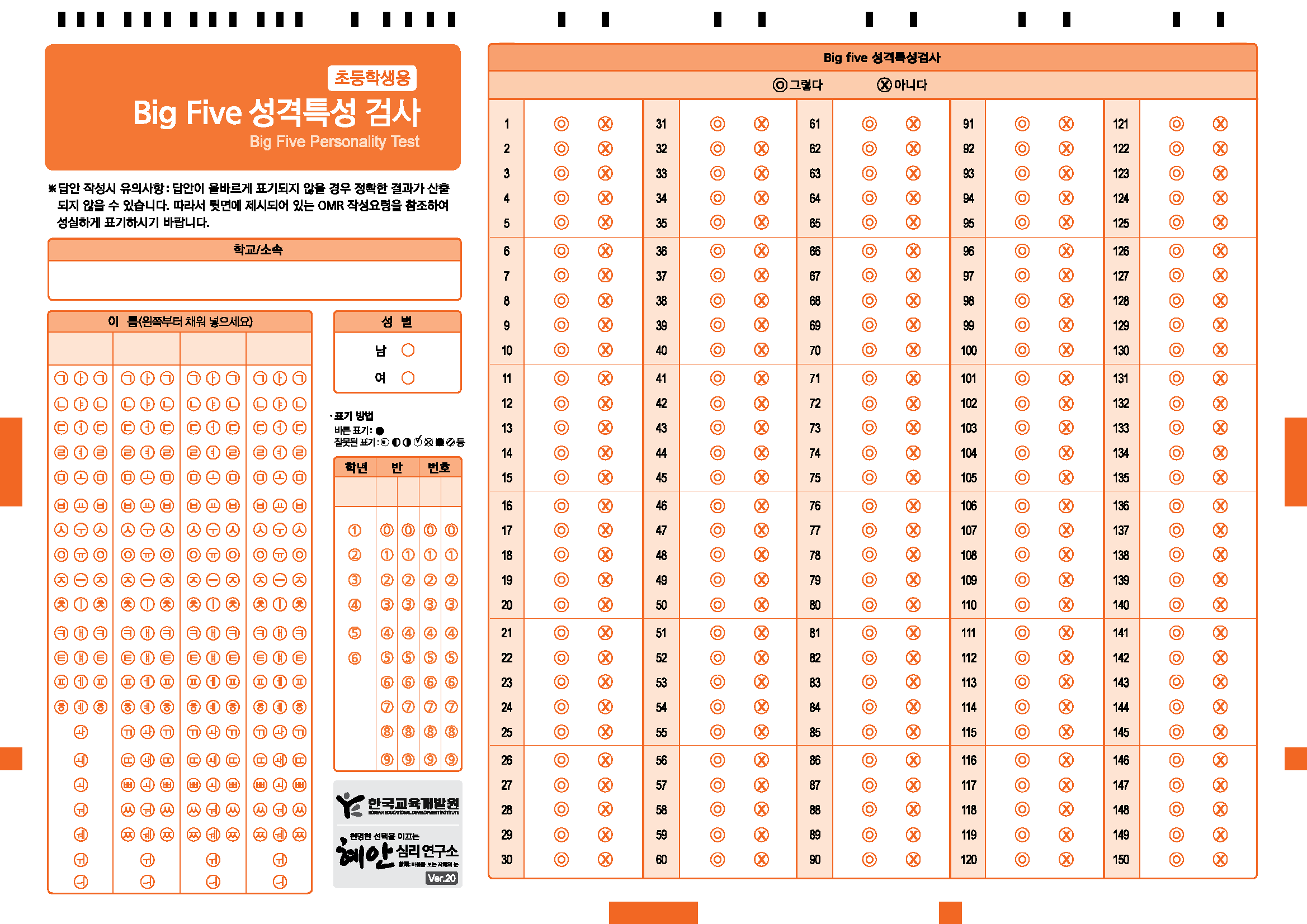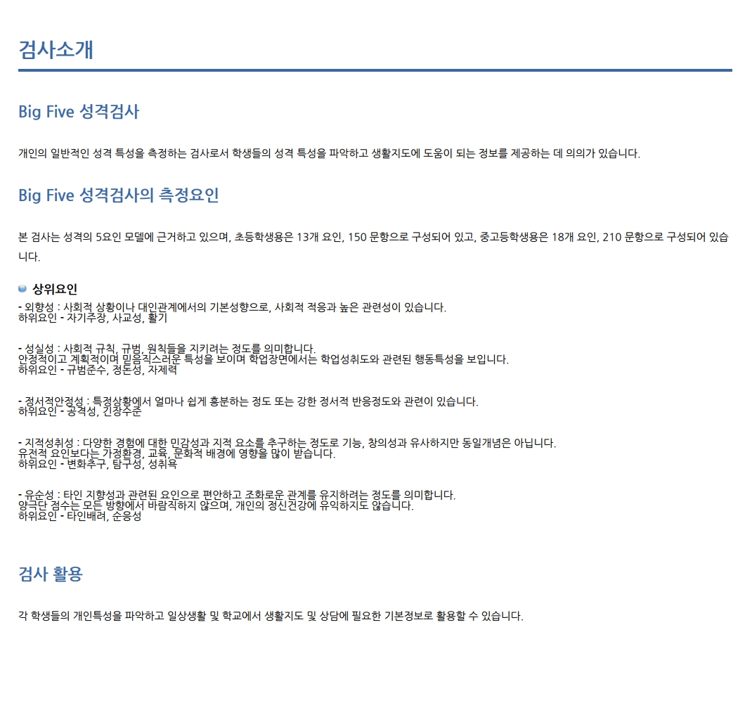 컨텐츠(본문)영역 전문가/기관심리검사 Home 전문가/기관심리검사 특징 및 제공서비스 특징 및 제공서비스 검사종류 및 가격 상품 상세 구매 BIG FIVE 성격검사(초) 추천 인기 음성지원 분류 성격(인성) 저자/연구개발 한국적성연구소 검사대상 초등학생 문항수 150문항 소요시간 약 40분 참조 ※ 온라인검사를 실시하기 위해서는 검사실시코드를 구매하여 검사를 진행하시면 됩니다. 세부상품 (필수)선택해주세요. 검사실시코드 (4,000원) 검사지 + 검사실시코드 (4,500원) 총 검사 상품 금액 0원 검사맛보기 장바구니 주문하기 WEB결과샘플 PDF결과샘플 피검자(동일검사를 2회이상 실시)의 변화추이를 확인하는데 도움이 됩니다. 개인웹비교결과샘플 개인사전사후결과샘플 개인누적비교결과샘플 그룹(동일검사를 2회이상 실시)의 변화추이를 확인하는데 도움이 됩니다. 그룹종합결과샘플 그룹사전사후결과샘플 그룹누적비교결과샘플 검사정보 관련검사 상품 검사문의 관련검사 상품 관련 심리검사 BIG FIVE 성격검사(중) BIG FIVE 성격검사(고) 검사문의 Page 1 / 0 총 0건 해당 검사에 대한 문의만 해주시길 바랍니다. 검사문의 쓰기 게시판 리스트 번호 제목 답변상태 작성자 작성일 No Data.