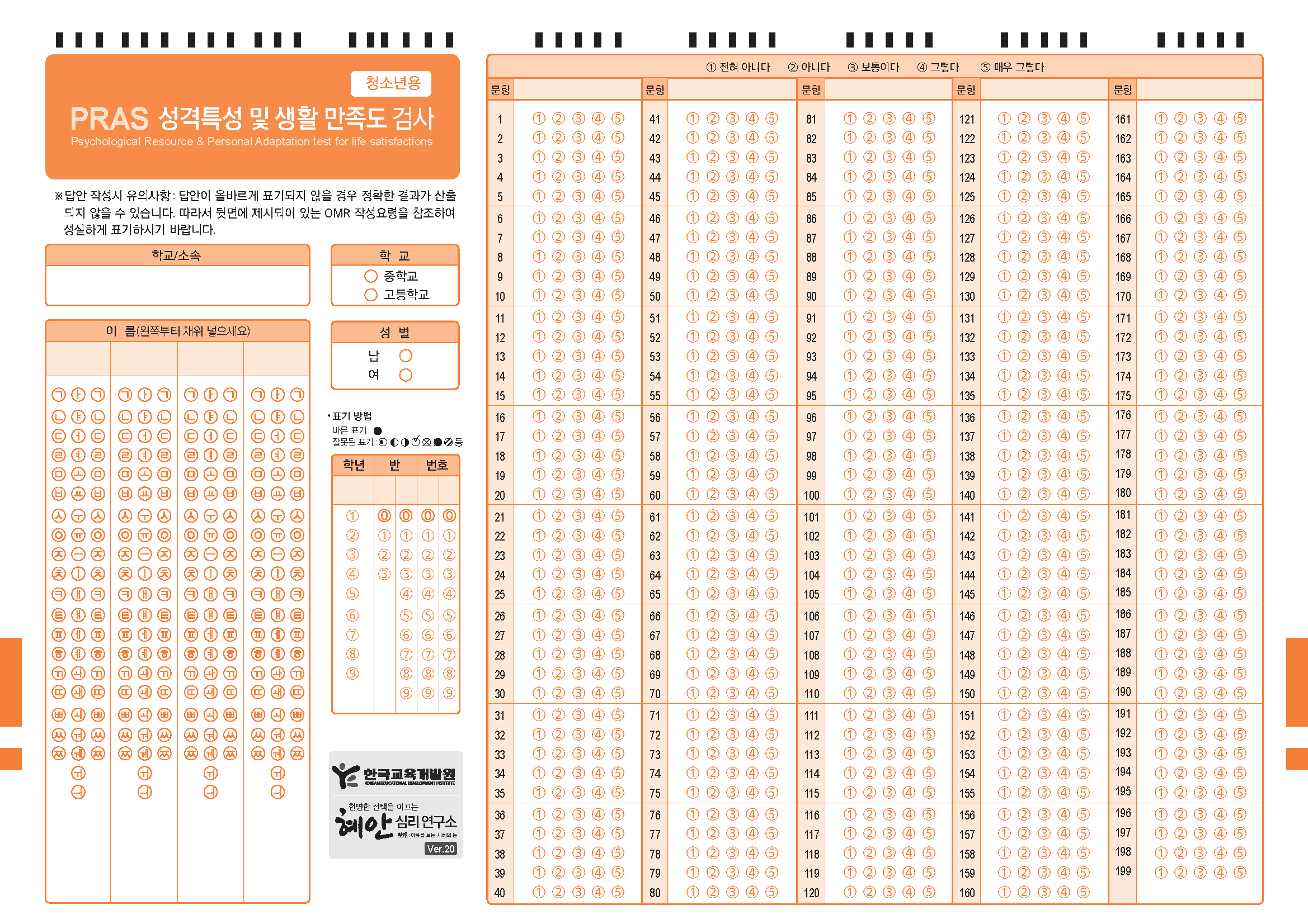 컨텐츠(본문)영역 전문가/기관심리검사 Home 전문가/기관심리검사 특징 및 제공서비스 특징 및 제공서비스 검사종류 및 가격 상품 상세 구매 PRAS 성격특성 및 생활만족도검사(중) 추천 음성지원 분류 성격(인성) 저자/연구개발 혜안심리연구소 검사대상 중학생 문항수 199문항 소요시간 약 45분 참조 ※ 온라인검사를 실시하기 위해서는 검사실시코드를 구매하여 검사를 진행하시면 됩니다. 세부상품 (필수)선택해주세요. 검사실시코드 (4,000원) 검사지 + 검사실시코드 (4,500원) 총 검사 상품 금액 0원 검사맛보기 장바구니 주문하기 WEB결과샘플 PDF결과샘플 피검자(동일검사를 2회이상 실시)의 변화추이를 확인하는데 도움이 됩니다. 개인웹비교결과샘플 개인사전사후결과샘플 개인누적비교결과샘플 그룹(동일검사를 2회이상 실시)의 변화추이를 확인하는데 도움이 됩니다. 그룹종합결과샘플 그룹사전사후결과샘플 그룹누적비교결과샘플 검사정보 관련검사 상품 검사문의 관련검사 상품 관련 심리검사 PRAS 성격특성 및 생활만족도검사(고) 검사문의 Page 1 / 0 총 0건 해당 검사에 대한 문의만 해주시길 바랍니다. 검사문의 쓰기 게시판 리스트 번호 제목 답변상태 작성자 작성일 No Data.