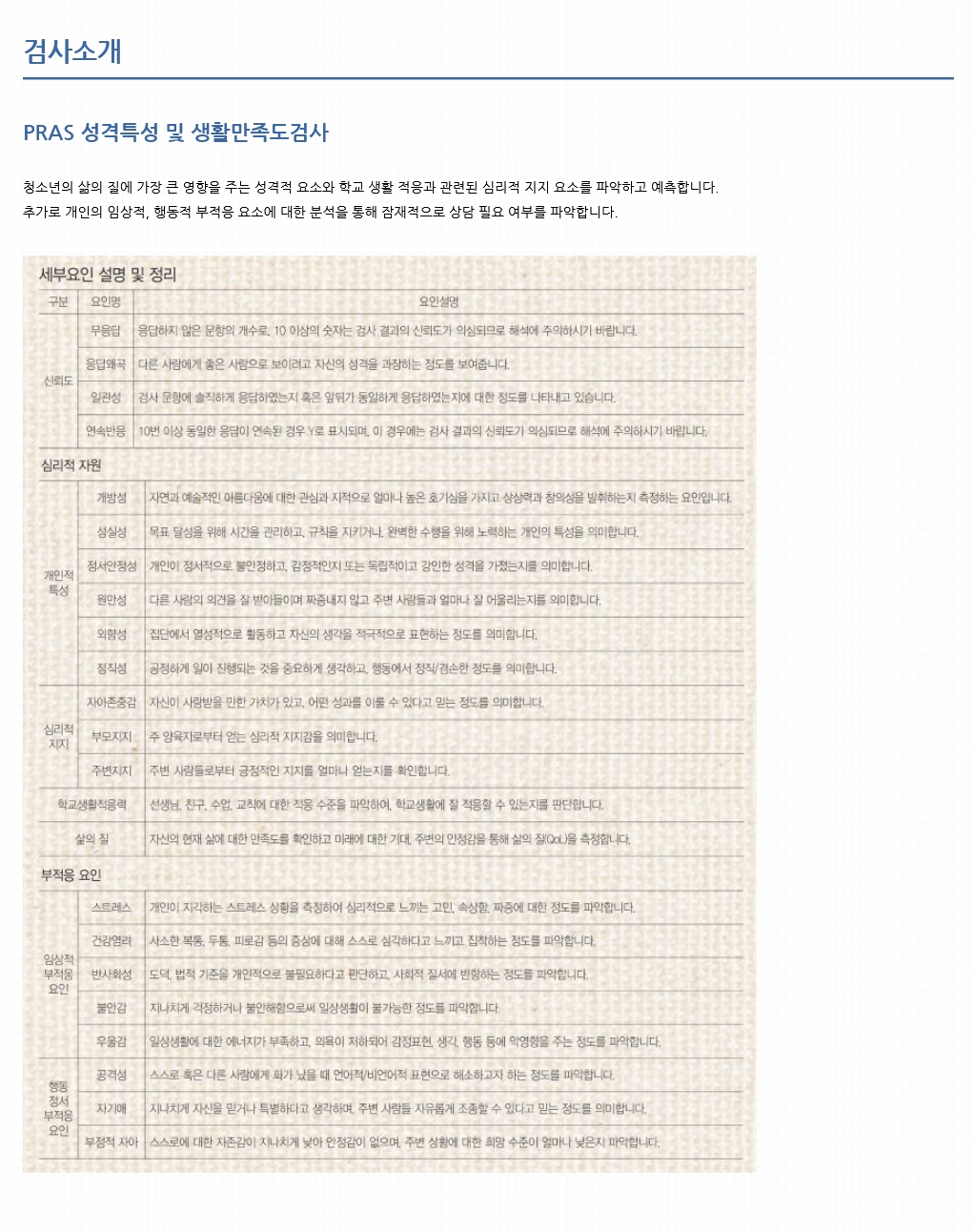 컨텐츠(본문)영역 전문가/기관심리검사 Home 전문가/기관심리검사 특징 및 제공서비스 특징 및 제공서비스 검사종류 및 가격 상품 상세 구매 PRAS 성격특성 및 생활만족도검사(고) 추천 음성지원 분류 성격(인성) 저자/연구개발 혜안심리연구소 검사대상 고등학생 문항수 199문항 소요시간 약 45분 참조 ※ 온라인검사를 실시하기 위해서는 검사실시코드를 구매하여 검사를 진행하시면 됩니다. 세부상품 (필수)선택해주세요. 검사실시코드 (4,000원) 검사지 + 검사실시코드 (4,500원) 총 검사 상품 금액 0원 검사맛보기 장바구니 주문하기 WEB결과샘플 PDF결과샘플 피검자(동일검사를 2회이상 실시)의 변화추이를 확인하는데 도움이 됩니다. 개인웹비교결과샘플 개인사전사후결과샘플 개인누적비교결과샘플 그룹(동일검사를 2회이상 실시)의 변화추이를 확인하는데 도움이 됩니다. 그룹종합결과샘플 그룹사전사후결과샘플 그룹누적비교결과샘플 검사정보 관련검사 상품 검사문의 관련검사 상품 관련 심리검사 PRAS 성격특성 및 생활만족도검사(중) 검사문의 Page 1 / 0 총 0건 해당 검사에 대한 문의만 해주시길 바랍니다. 검사문의 쓰기 게시판 리스트 번호 제목 답변상태 작성자 작성일 No Data.