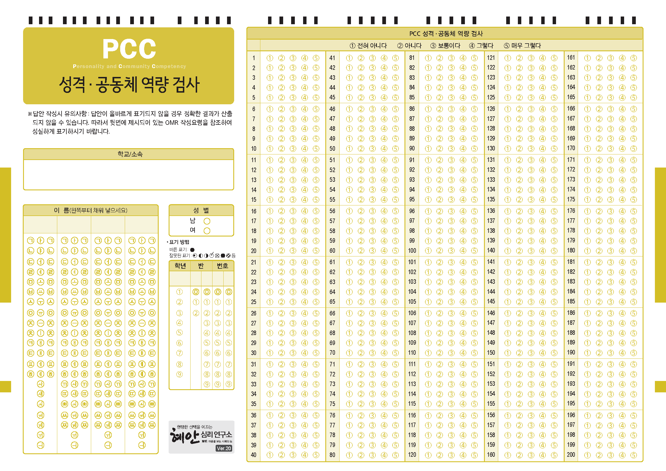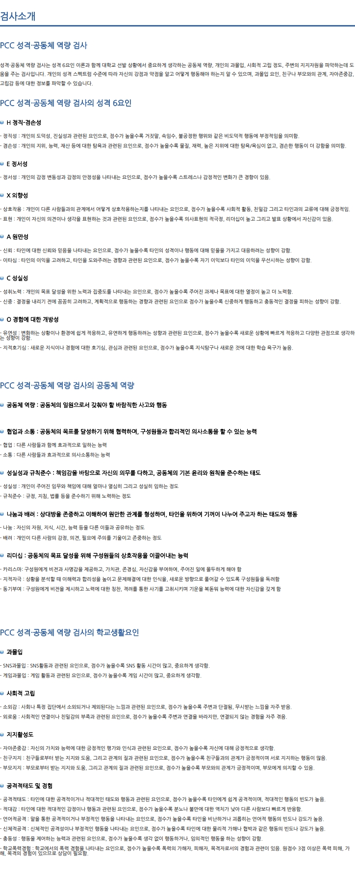 컨텐츠(본문)영역 전문가/기관심리검사 Home 전문가/기관심리검사 특징 및 제공서비스 특징 및 제공서비스 검사종류 및 가격 상품 상세 구매 PCC 성격 공동체 역량 검사(고) 추천 음성지원 분류 성격(인성) 저자/연구개발 혜안심리연구소 검사대상 고등학생 문항수 200문항 소요시간 약 45분 참조 ※ 온라인검사를 실시하기 위해서는 검사실시코드를 구매하여 검사를 진행하시면 됩니다. 세부상품 (필수)선택해주세요. 검사실시코드 (4,000원) 검사지 + 검사실시코드 (4,500원) 총 검사 상품 금액 0원 검사맛보기 장바구니 주문하기 WEB결과샘플 PDF결과샘플 피검자(동일검사를 2회이상 실시)의 변화추이를 확인하는데 도움이 됩니다. 개인웹비교결과샘플 개인사전사후결과샘플 개인누적비교결과샘플 그룹(동일검사를 2회이상 실시)의 변화추이를 확인하는데 도움이 됩니다. 그룹종합결과샘플 그룹사전사후결과샘플 그룹누적비교결과샘플 검사정보 관련검사 상품 검사문의 관련검사 상품 관련 심리검사 PCC 성격 공동체 역량 검사(중) 검사문의 Page 1 / 0 총 0건 해당 검사에 대한 문의만 해주시길 바랍니다. 검사문의 쓰기 게시판 리스트 번호 제목 답변상태 작성자 작성일 No Data.