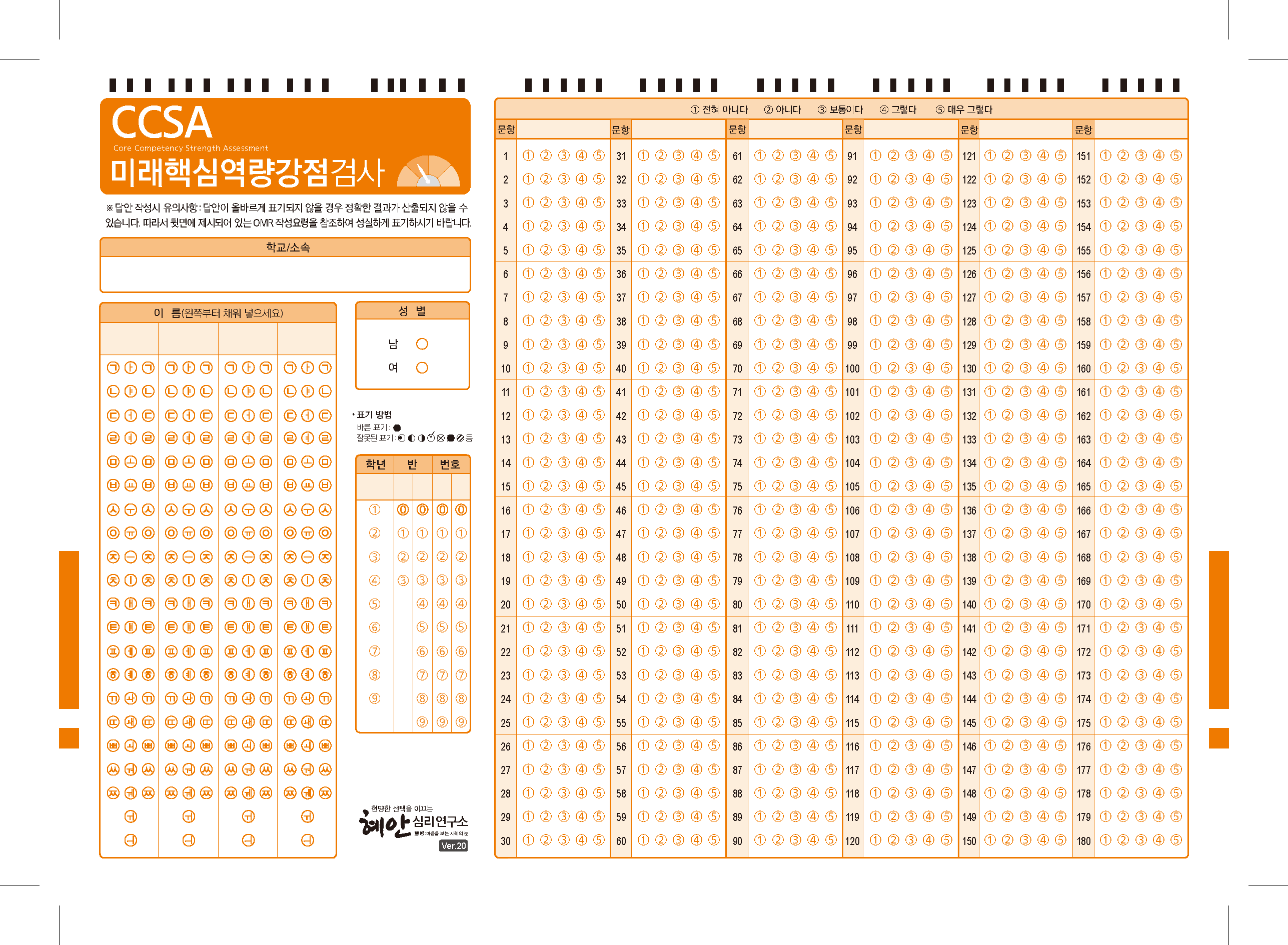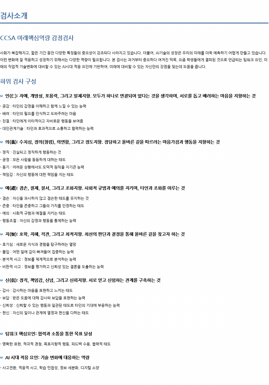 컨텐츠(본문)영역 전문가/기관심리검사 Home 전문가/기관심리검사 특징 및 제공서비스 특징 및 제공서비스 검사종류 및 가격 상품 상세 구매 CCSA 미래핵심역량 강점검사(고) 추천 new 음성지원 분류 성격(인성) 저자/연구개발 혜안심리연구소 검사대상 고등학생 문항수 180문항 소요시간 약 40분 참조 ※ 온라인검사를 실시하기 위해서는 검사실시코드를 구매하여 검사를 진행하시면 됩니다. 세부상품 (필수)선택해주세요. 검사실시코드 (4,000원) 총 검사 상품 금액 0원 검사맛보기 장바구니 주문하기 WEB결과샘플 PDF결과샘플 피검자(동일검사를 2회이상 실시)의 변화추이를 확인하는데 도움이 됩니다. 개인웹비교결과샘플 개인사전사후결과샘플 개인누적비교결과샘플 그룹(동일검사를 2회이상 실시)의 변화추이를 확인하는데 도움이 됩니다. 그룹종합결과샘플 그룹사전사후결과샘플 그룹누적비교결과샘플 검사정보 관련검사 상품 검사문의 관련검사 상품 관련 심리검사 CCSA 미래핵심역량 강점검사(중) 검사문의 Page 1 / 0 총 0건 해당 검사에 대한 문의만 해주시길 바랍니다. 검사문의 쓰기 게시판 리스트 번호 제목 답변상태 작성자 작성일 No Data.