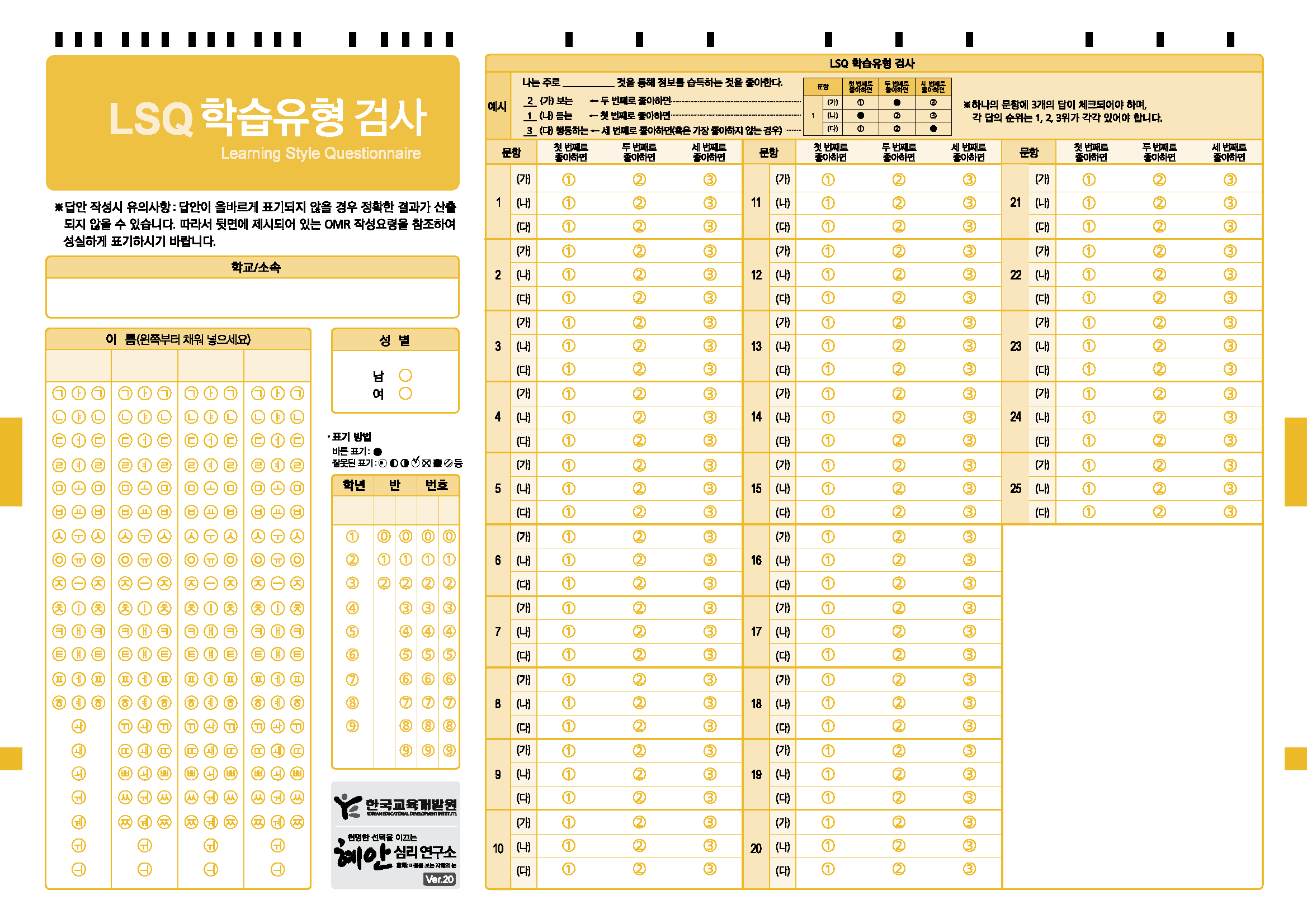 컨텐츠(본문)영역 전문가/기관심리검사 Home 전문가/기관심리검사 특징 및 제공서비스 특징 및 제공서비스 검사종류 및 가격 상품 상세 구매 LSQ 학습유형검사(초) 추천 음성지원 분류 학습 저자/연구개발 정종진 교수 검사대상 초등학생 문항수 25문항 소요시간 약 30분 참조 ※ 온라인검사를 실시하기 위해서는 검사실시코드를 구매하여 검사를 진행하시면 됩니다. 세부상품 (필수)선택해주세요. 검사실시코드 (4,000원) 검사지 + 검사실시코드 (4,500원) 총 검사 상품 금액 0원 검사맛보기 장바구니 주문하기 WEB결과샘플 PDF결과샘플 피검자(동일검사를 2회이상 실시)의 변화추이를 확인하는데 도움이 됩니다. 개인웹비교결과샘플 개인사전사후결과샘플 개인누적비교결과샘플 그룹(동일검사를 2회이상 실시)의 변화추이를 확인하는데 도움이 됩니다. 그룹종합결과샘플 그룹사전사후결과샘플 그룹누적비교결과샘플 검사정보 관련검사 상품 검사문의 관련검사 상품 관련 심리검사 LSQ 학습유형검사(중) LSQ 학습유형검사(고) 검사문의 Page 1 / 0 총 0건 해당 검사에 대한 문의만 해주시길 바랍니다. 검사문의 쓰기 게시판 리스트 번호 제목 답변상태 작성자 작성일 No Data.