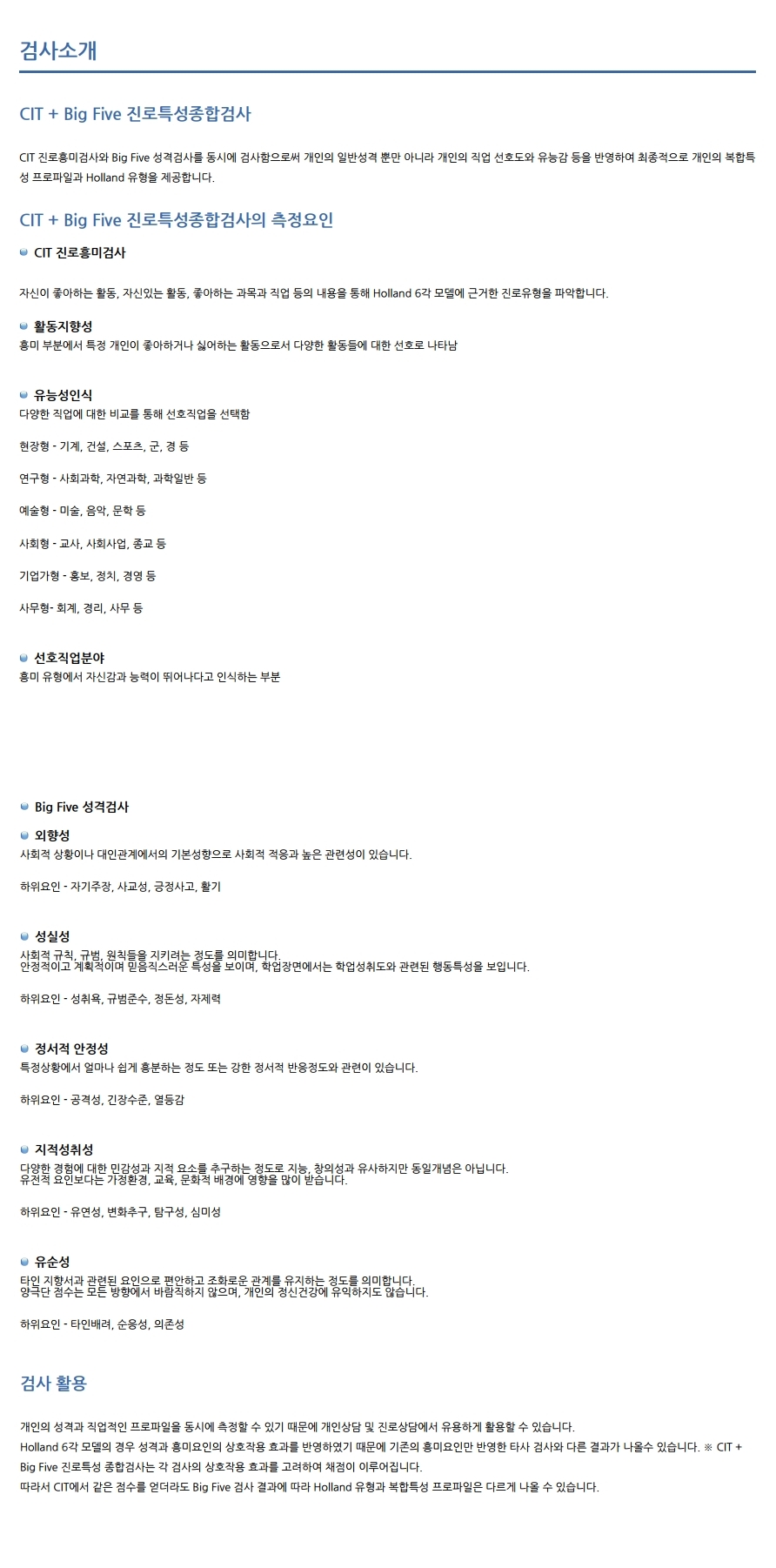 컨텐츠(본문)영역 전문가/기관심리검사 Home 전문가/기관심리검사 특징 및 제공서비스 특징 및 제공서비스 검사종류 및 가격 상품 상세 구매 진로특성 종합검사(고) 음성지원 분류 종합 저자/연구개발 한국적성연구소 검사대상 고등학생 문항수 360문항 소요시간 약 90분 참조 ※ 온라인검사를 실시하기 위해서는 검사실시코드를 구매하여 검사를 진행하시면 됩니다. 세부상품 (필수)선택해주세요. 검사실시코드 (7,000원) 총 검사 상품 금액 0원 장바구니 주문하기 WEB결과샘플 PDF결과샘플 피검자(동일검사를 2회이상 실시)의 변화추이를 확인하는데 도움이 됩니다. 개인웹비교결과샘플 개인사전사후결과샘플 개인누적비교결과샘플 그룹(동일검사를 2회이상 실시)의 변화추이를 확인하는데 도움이 됩니다. 그룹종합결과샘플 그룹사전사후결과샘플 그룹누적비교결과샘플 검사정보 관련검사 상품 검사문의 관련검사 상품 관련 심리검사 진로특성 종합검사(중) CIT 진로흥미검사(중) CIT 진로흥미검사(고) BIG FIVE 성격검사(중) BIG FIVE 성격검사(고) 검사문의 Page 1 / 0 총 0건 해당 검사에 대한 문의만 해주시길 바랍니다. 검사문의 쓰기 게시판 리스트 번호 제목 답변상태 작성자 작성일 No Data.