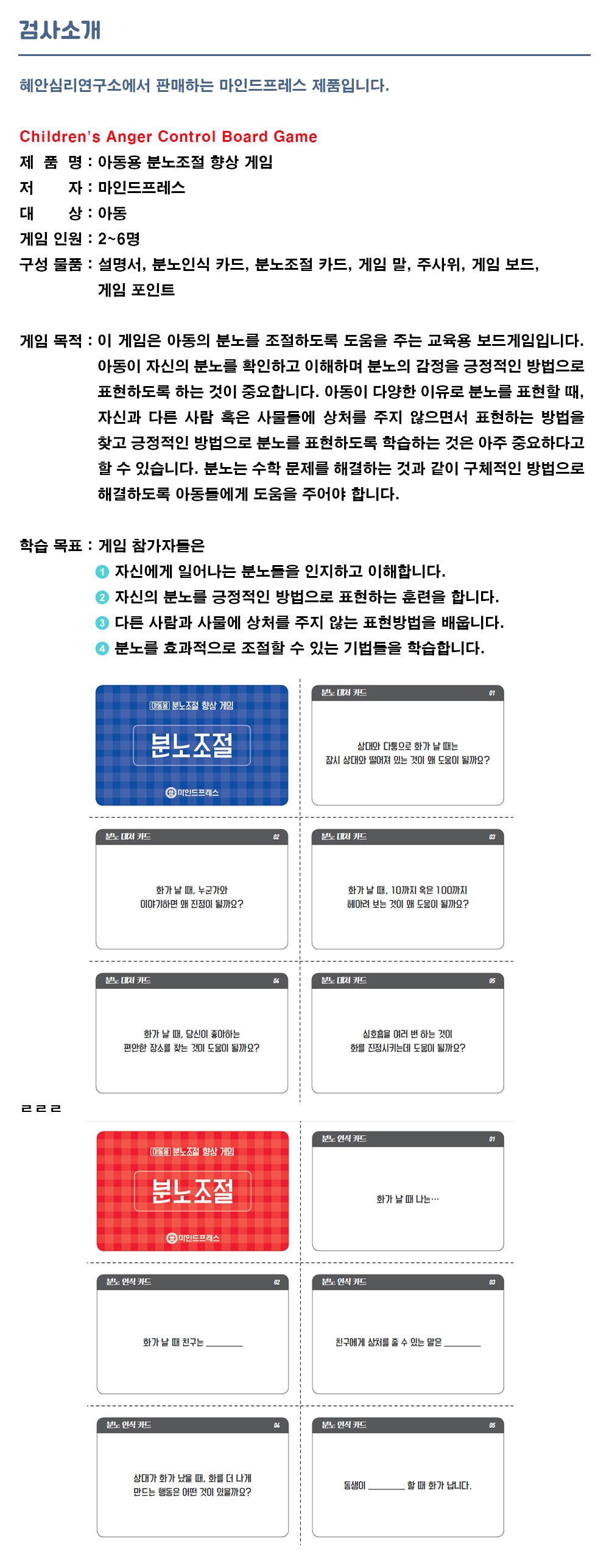 컨텐츠(본문)영역 전문가/기관심리검사 Home 전문가/기관심리검사 특징 및 제공서비스 특징 및 제공서비스 검사종류 및 가격 상품 상세 구매 분노조절 향상게임 분류 도구 저자/연구개발 검사대상 아동 문항수 소요시간 참조 ※ 온라인검사를 실시하기 위해서는 검사실시코드를 구매하여 검사를 진행하시면 됩니다. 세부상품 (필수)선택해주세요. 게임 (45,000원) 총 검사 상품 금액 0원 장바구니 주문하기 검사정보 관련검사 상품 검사문의 관련검사 상품 검사문의 Page 1 / 0 총 0건 해당 검사에 대한 문의만 해주시길 바랍니다. 검사문의 쓰기 게시판 리스트 번호 제목 답변상태 작성자 작성일 No Data.