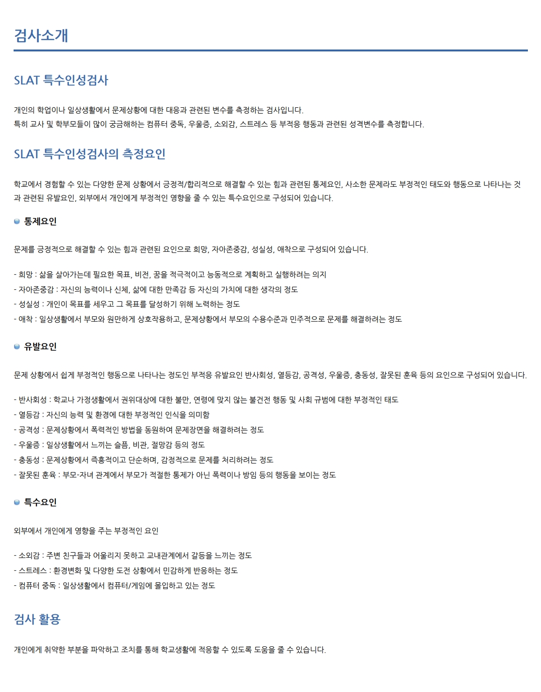 컨텐츠(본문)영역 개인일반심리검사 Home 개인일반심리검사 검사종류 및 가격 특징 및 제공서비스 검사종류 및 가격 검사추천가이드 상품 상세 구매 SLAT 특수인성검사(초) 추천 인기 음성지원 분류 성격(인성) 저자/연구개발 양종국 교수 검사대상 초등학생 문항수 200문항 소요시간 약 40분 ~ 45분 참조 ※ 온라인검사를 실시하기 위해서는 검사실시코드를 구매하여 검사를 진행하시면 됩니다. 세부상품 (필수)선택해주세요. 검사실시코드 (5,000원) 검사지 + 검사실시코드 (5,500원) 총 검사 상품 금액 0원 검사맛보기 장바구니 주문하기 WEB결과샘플 PDF결과샘플 개인(동일검사를 2회이상 실시)의 변화추이를 확인하는데 도움이 됩니다. 개인웹비교결과샘플 개인사전사후결과샘플 개인누적비교결과샘플 검사정보 관련검사 상품 검사문의 관련검사 상품 관련 심리검사 SLAT 특수인성검사(중) SLAT 특수인성검사(고) 검사문의 Page 1 / 0 총 0건 해당 검사에 대한 문의만 해주시길 바랍니다. 검사문의 쓰기 게시판 리스트 번호 제목 답변상태 작성자 작성일 No Data.