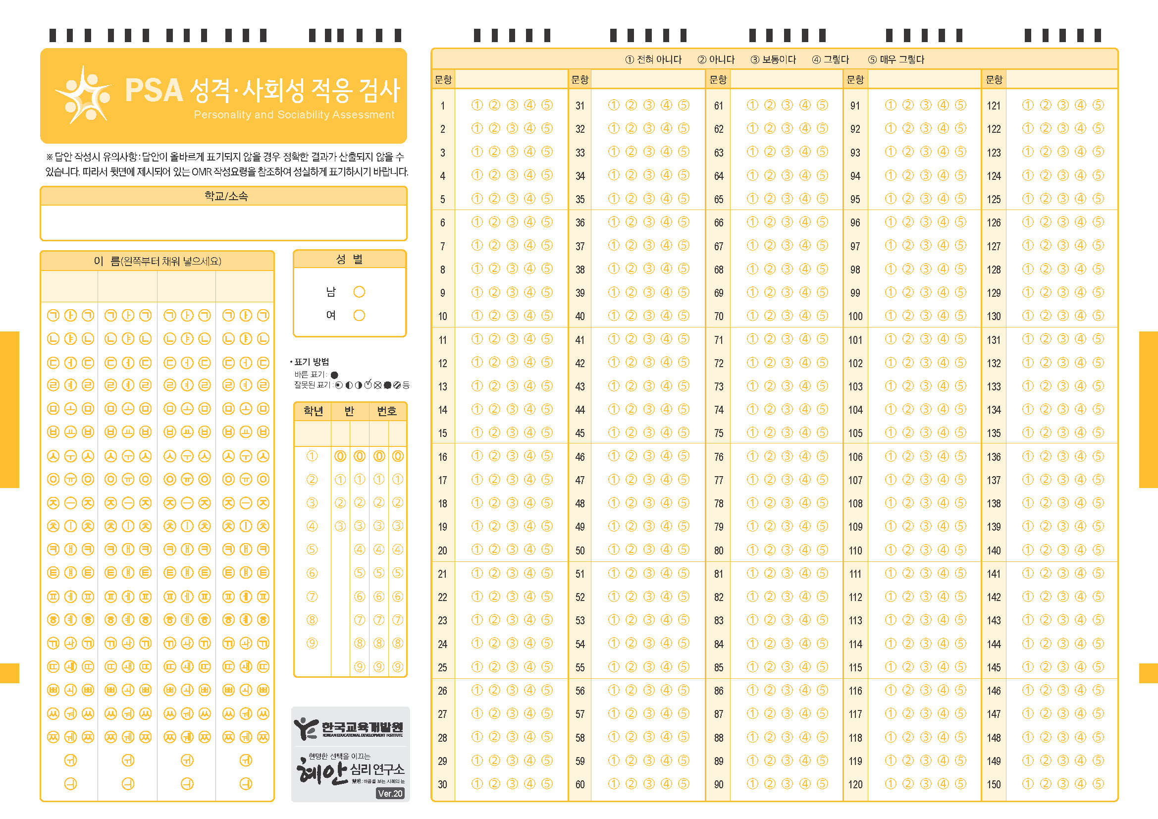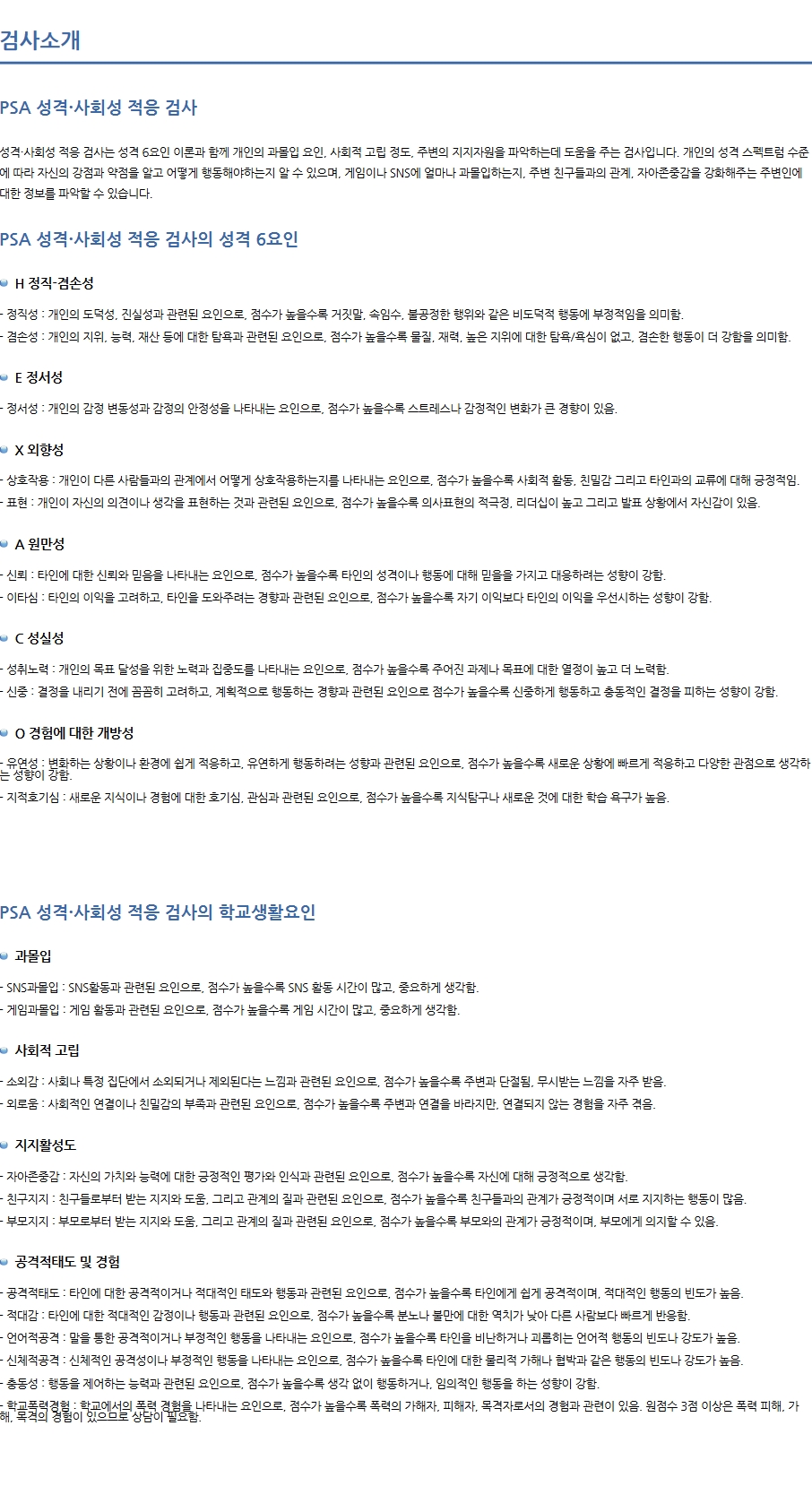 컨텐츠(본문)영역 개인일반심리검사 Home 개인일반심리검사 검사종류 및 가격 특징 및 제공서비스 검사종류 및 가격 검사추천가이드 상품 상세 구매 PSA 성격 사회성 적응 검사(초) 추천 음성지원 분류 성격(인성) 저자/연구개발 혜안심리연구소 검사대상 초등 4~6학년 문항수 150문항 소요시간 약 40분 참조 ※ 온라인검사를 실시하기 위해서는 검사실시코드를 구매하여 검사를 진행하시면 됩니다. 세부상품 (필수)선택해주세요. 검사실시코드 (5,000원) 검사지 + 검사실시코드 (5,500원) 총 검사 상품 금액 0원 검사맛보기 장바구니 주문하기 WEB결과샘플 PDF결과샘플 개인(동일검사를 2회이상 실시)의 변화추이를 확인하는데 도움이 됩니다. 개인웹비교결과샘플 개인사전사후결과샘플 개인누적비교결과샘플 검사정보 관련검사 상품 검사문의 관련검사 상품 검사문의 Page 1 / 0 총 0건 해당 검사에 대한 문의만 해주시길 바랍니다. 검사문의 쓰기 게시판 리스트 번호 제목 답변상태 작성자 작성일 No Data.