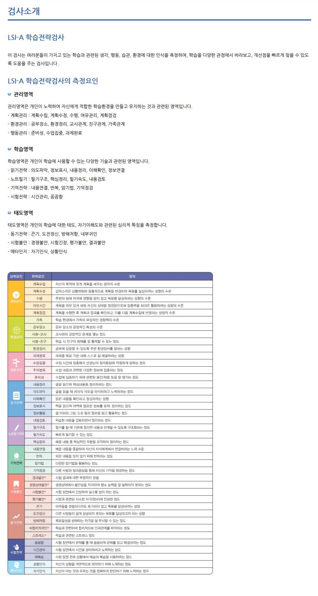 컨텐츠(본문)영역 개인일반심리검사 Home 개인일반심리검사 검사종류 및 가격 특징 및 제공서비스 검사종류 및 가격 검사추천가이드 상품 상세 구매 LSI-A 학습전략검사(중) 추천 인기 음성지원 분류 학습 저자/연구개발 변창진 교수(경북대학교 교육학과) 검사대상 중학생 문항수 166 소요시간 약 45분 참조 ※ 온라인검사를 실시하기 위해서는 검사실시코드를 구매하여 검사를 진행하시면 됩니다. 세부상품 (필수)선택해주세요. 검사실시코드 (5,000원) 검사지 + 검사실시코드 (5,500원) 총 검사 상품 금액 0원 검사맛보기 장바구니 주문하기 WEB결과샘플 PDF결과샘플 개인(동일검사를 2회이상 실시)의 변화추이를 확인하는데 도움이 됩니다. 개인웹비교결과샘플 개인사전사후결과샘플 개인누적비교결과샘플 검사정보 관련검사 상품 검사문의 관련검사 상품 관련 심리검사 LSI-A 학습전략검사(고) 검사문의 Page 1 / 0 총 0건 해당 검사에 대한 문의만 해주시길 바랍니다. 검사문의 쓰기 게시판 리스트 번호 제목 답변상태 작성자 작성일 No Data.
